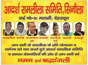 देहरादून। राजधानी देहरादून के जोहड़ी गांव सिनोला में चल रहे आदर्श श्री रामलीला महोत्सव में श्रीराम के जीवन चरित्र, मर्यादा और आदर्शों की अद्भुत झांकी प्रस्तुत करते हुए आदर्श श्री रामलीला महोत्सव के तीसरे दिन का मंचन दिव्य और भव्य रूप में सम्पन्न हुआ। संपूर्ण परिसर “जय श्री राम” के उद्घोषों से गूंज उठा और वातावरण में भक्ति एवं उत्साह का संचार हो गया।