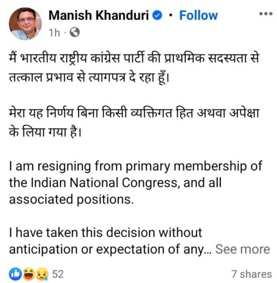 इंटरनेट मीडिया पर पोस्ट में कांग्रेस के वरिष्ठ नेता मनीष खंडूड़ी ने कहा कि वह स्वेच्छा से त्यागपत्र दे रहे हैं। लोकसभा चुनाव से पहले मनीष के इस कदम को पार्टी के लिए बड़े झटके के रूप में देखा जा रहा है। अभी उन्होंने आगे की रणनीति के बारे में कुछ जानकारी देने से इंकार कर दिया है।