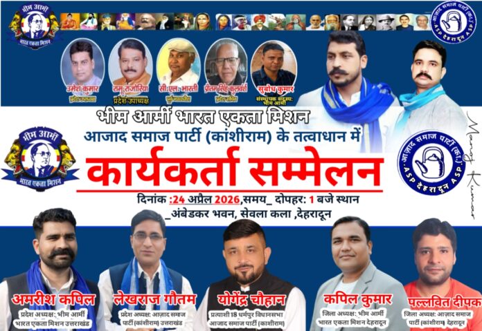 देहरादून। भीम आर्मी भारत एकता मिशन के तत्वावधान में आजाद समाज पार्टी (कांशीराम) द्वारा आज, 24 अप्रैल 2026 को एक महत्वपूर्ण कार्यकर्ता सम्मेलन आयोजित किया जा रहा है। यह कार्यक्रम दोपहर एक बजे अंबेडकर भवन, सेवला कला देहरादून में आयोजित होगा।