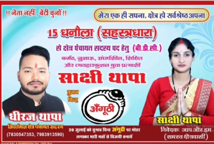 रायपुर ब्लॉक की धनोला क्षेत्र पंचायत सदस्य के चुनाव में निवर्तमान क्षेत्र पंचायत सदस्य धीरज थापा ने अपनी पत्नी साक्षी थापा एक सशक्त प्रत्याशी के रूप में सामने आई हैं। अपने पति धीरज थापा द्वारा किए गए उल्लेखनीय विकास कार्यों की मजबूत नींव पर साक्षी थापा धनोला के विकास को नई ऊंचाइयों तक ले जाने के लिए प्रतिबद्ध हैं। उनका विजन है कि धनोला को एक समृद्ध, सुविधायुक्त और आत्मनिर्भर क्षेत्र बनाया जाए। जिसके लिए उन्होंने क्षेत्र की समस्त जनता से वोट के रुप में अपना आशीर्वाद देने की अपील की है।