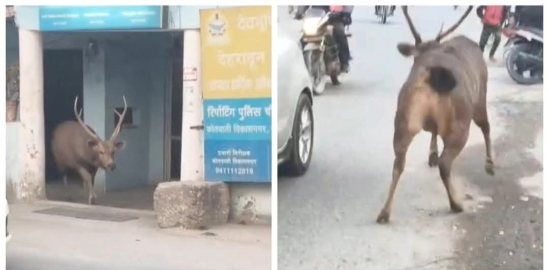 देहरादून। राजधानी देहरादून के कुल्हाल बॉर्डर क्षेत्र में उस समय अफरा -तफरी मच गई, जब एक जंगली सांभर अचानक पुलिस चौकी के भीतर घुस आया। अप्रत्याशित रूप से चौकी परिसर में सांभर को देखकर पुलिसकर्मियों और आसपास मौजूद लोगों में हड़कंप मच गया। स्थिति तब और गंभीर हो गई, जब सांभर चौकी से बाहर निकलकर व्यस्त बाजार की ओर दौड़ पड़ा।