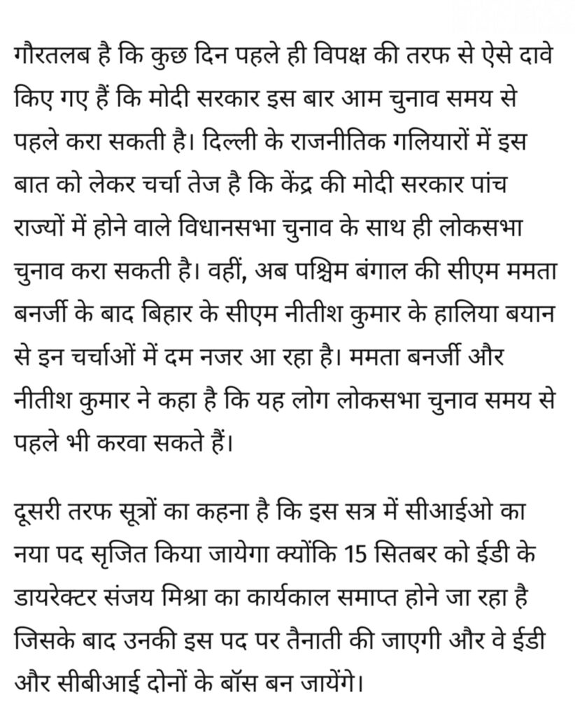 देहरादून। प्रधानमंत्री नरेंद्र मोदी ने अचानक संसद का सत्र बुलाने का फैसला किया है, इस सत्र को बुलाने से देश में राजनीतिक चर्चाएं तेज़ हो गयी है। सत्र में कुछ महत्वपूर्ण विधेयक पास किए जा सकते हैं। राजनीतिक गलियारों में इस सत्र के बाद देश में समय पूर्व चुनाव कराने की संभावनाएं जताई जा रही है।