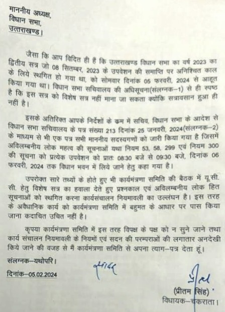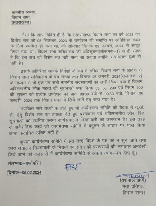 देहरादून। उत्तराखंड विधानसभा सत्र के पहले दिन की कार्यवाही 6 फरवरी की सुबह 11 बजे तक के लिए स्थगित कर दी गई है। सदन के पहले दिन की कार्यवाही के बाद विधानसभा अध्यक्ष ऋतु खंडूरी की अध्यक्षता में कार्य मंत्रणा समिति की बैठक बुलाई गई. बैठक में सदन की कार्यवाही को लेकर चर्चा की गई. चर्चा के दौरान ही नेता प्रतिपक्ष यशपाल आर्य और विपक्षी विधायक प्रीतम सिंह ने कार्य मंत्रणा समिति की सदस्यता से इस्तीफा दे दिया. इसके बाद विपक्ष के ये दोनों नेता बैठक से बाहर निकल आये।
