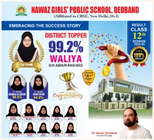 सहारनपुर। नवाज़ गर्ल्स स्कूल देवबंद की स्टूडेंट्स ने पिछले महीने जारी हुए सीबीएसई बोर्ड के परीक्षा परिणामों में शानदार प्रदर्शन करते हुए अपने स्कूल का नाम रोशन किया है. इस बार जिले का टॉपर्स बनने में इसी स्कूल की छात्रा ने बाजी मारी है और ऑल इंडिया टॉपर्स की सूची में भी प्रमुखता से जगह बनाई है।